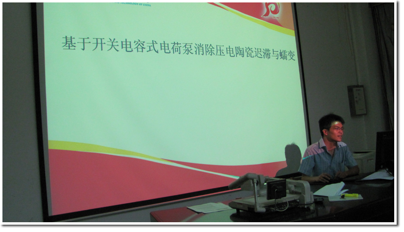 黄亮硕士报告的题目是《基于开关电容式电荷泵消除压电陶瓷迟滞与蠕变特性》。他细致地向大家介绍了压电效应以及压电陶瓷迟滞对精密控制的影响,然后介绍了前人提出的解决方案。之后他介绍了他自己的解决方法,并介绍了他的解决方法的重要性。