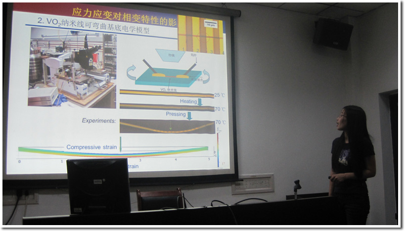 首先是范雯博士拿出了她在伯克利期间所作的工作,与大家分享。报告的题目是《二氧化钒微纳米线的相变特性及其在热电转换方面的应用研究》。她从二氧化钒微/纳米的基础性质出发,同时从实验和理论上研究应力应变、点缺陷、孪晶界等因素对其相变温度、相变区间分布及其时滞宽度的相变特性研究,并在此基础上介绍了进行二氧化钒微/纳米线悬臂梁在热驱动器及热电转换器等方面的应用研究工作及其优化。报告中还附有动态效果图,显得更生动易懂。