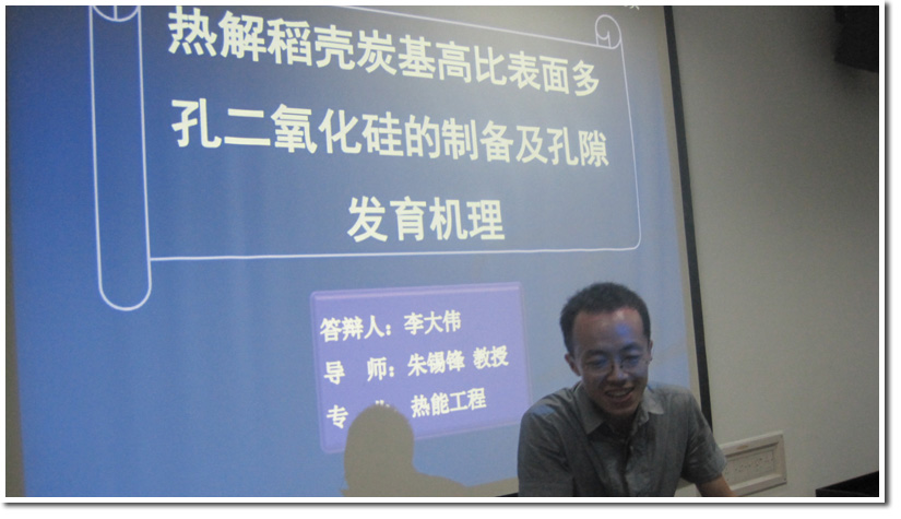 (3)李大伟博士于2001-2008年在中国矿业大学安全技术及工程专业学习,2008-2011年于中国科技大学热科学与能源工程系攻读博士学位,师从朱锡锋教授,相关研究成果发表在Bioresource technology 和materials letters上。 多孔二氧化硅孔隙结构发达,化学性质稳定,具有良好的消光性、隔热性、绝缘性,在吸附、分离、催化等许多领域均具有广阔的应用前景。多孔二氧化硅可以用稻壳基生物质原料制备。目前,国际上稻壳基多孔二氧化硅的比表面积为330-955 m2/g,制备时间长达25-144 h。本报告提出以磷酸为酸化剂、聚乙二醇为模板剂制备稻壳基多孔二氧化硅,并探讨了孔隙发育机制。所得材料的比表面积高达1018 m2/g,制备周期低于10 h。 近期主要论文: [1] Dawei Li, Dengyu Chen, Xifeng Zhu. Reduction in time required for synthesis of high specific surface area silica from pyrolyzed rice husk by precipitation at low pH. Bioresource Technology 102 (2011) 7001-7003 [2] Dawei Li, Xifeng Zhu. Short-period Synthesis of High Specific Surface Area Silica from Rice Husk Char. Materials Letters, 65 (2011) 1528-1530.