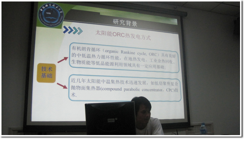 最后是李晶博士的报告,他的题目是《太阳能有机朗肯循环热发电系统研究及优化》。报告中介绍一种新型太阳能低温有机朗肯循环发电系统,该系统突破传统太阳高温热发电需要大面积、高聚焦比聚光集热以及复杂跟踪系统的局限,采用低倍聚焦与有机朗肯循环相结合的太阳能中低温热发电方式。