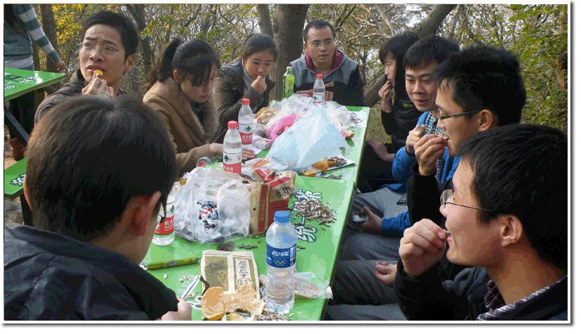 在山上休息片刻后,大家围着坐成一圈,边吃零食边做游戏,在轻松愉快的氛围中增进认识和了解,对日常学习和生活进行了有效的交流。