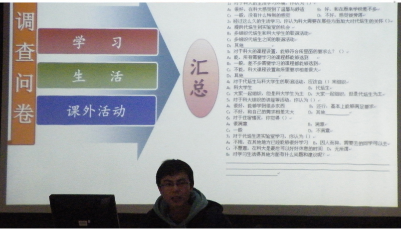 工程科学开元(中国)研究生会主席朱云龙同学介绍了工院研究生会近期及将来举办的代培生系列活动,并且就本次活动对代培生进行的问卷调查统计结果进行了总结。