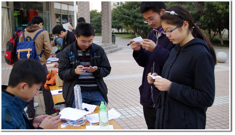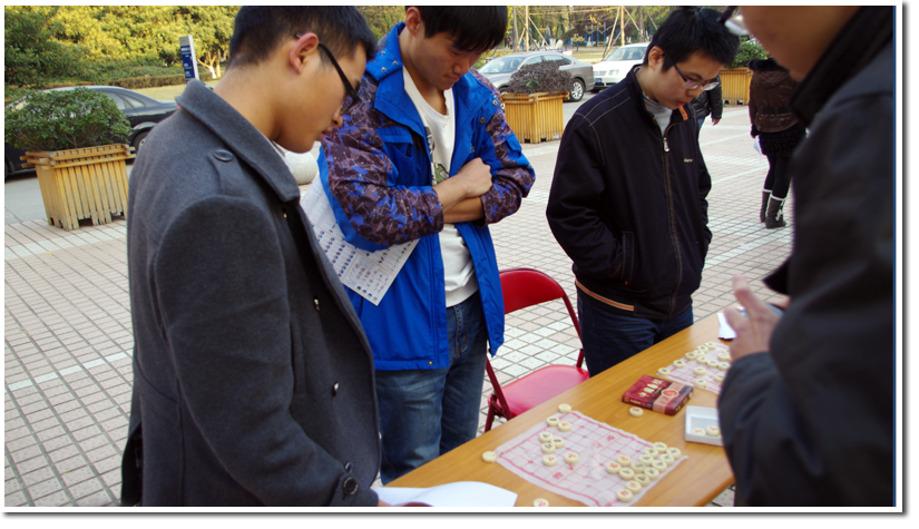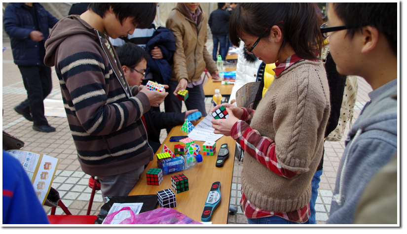 在魔方项目的区域不仅有挑战者的智力比拼,更有相关项目负责人在现场进行魔方还原表演,各种各样的魔方在他们手里神奇地迅速还原,这也让挑战者们大饱眼福,大呼痛快;而在象棋残局中也不断有强者涌出,这也让活动现场气氛更加活跃轻松;仰卧起坐的动作虽然简单,但在竞技中大家也能体会到不同的快乐;火眼金睛着实让很多挑战者感受到了难度,细微处的差别当真不易察觉,考验的不是智力,是大家的耐心与细心;推理对决也颇具难度,五人一组的竞争项目,挑战者既要做到波澜不惊又要做到思路清晰,难度不小。不过同学们不畏寒冷的积极参与使这场活动得以顺利举行。
