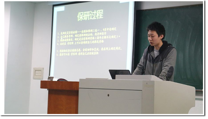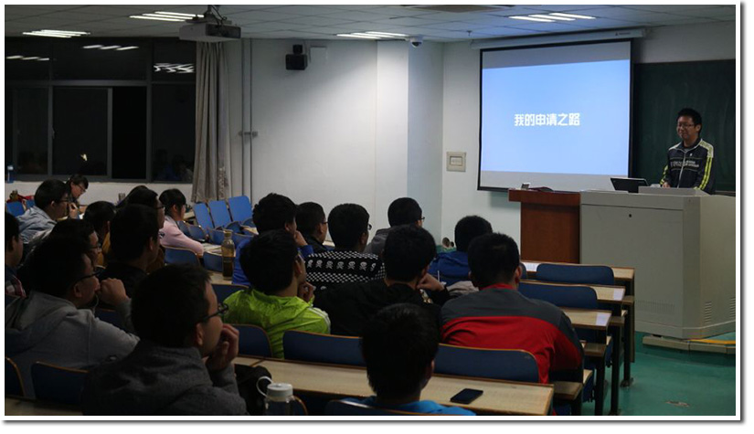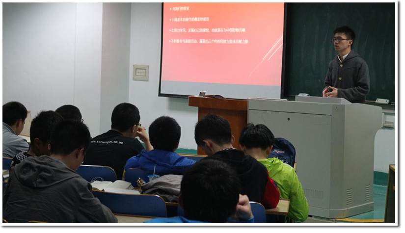 然后,经指导员老师邀请的几位11级学长向我们分享了他们的学习生活经历,具体包含了出国,保研,求职和考研的经验。其间,学长与我们的互动不断,气氛融洽。学长们的话语有如黑暗中的灯塔,为我们扫除了未知道路上的阴霾,激励着我们向梦想进发。