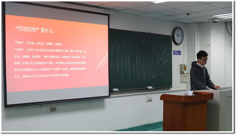 本次活动分为3个环节。首先由团支书向我们阐述了“四进四信”的含义以及践行社会主义核心价值观的重要意义,也向我们介绍了习近平总书记带领下中国的正确道路,让我们对习近平总书记的讲话精神有了更深层次的认识,增强了对领导人的信任。