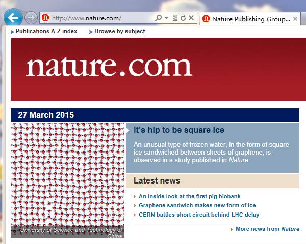 Nature网站以首页头条形式第一时间对该成果进行了报道,并在新闻配图上标注了University of Science and technology of China。同期Nature的新闻视点栏目(NEWS &VIEWS)邀请国际著名水科学家Alan K. Soper(英国皇家学会院士)以“Square ice in a graphene sandwich”为题对该成果进行了重点评论和展望。评论指出,该成果首次明确阐述了水在石墨烯毛细通道内的形态和范德华力在纳米尺度下起到的重要作用,有助于人们进一步认识生物通道内或表面水的输运机制和流动控制机理。