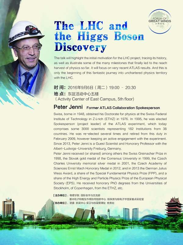 应基本粒子和相互作用协同创新中心以及核探测与核电子学国家重点实验室赵政国院士邀请,ATLAS前发言人Peter Jenni教授访问我校,并做精彩报告。 报告题目:大型强子对撞机与希格斯玻色子的发现; The LHC and the Higgs Boson Discovery; 报告时间:9月6日(周二)19:00-20:30; 报告地点:东活五楼学术报告厅。 报告人简介:Peter Jenni,1976年毕业于苏黎世联邦理工开元(中国),获得博士学位。长期工作于高能物理实验领域,曾参加MARKII,UA2和ATLAS等高能实验组,在高能物理领域取得了很高的成就,获得了很多荣誉。作为先驱,从1984年开始参与ATLAS实验的研究工作,1995年开始担任ATLAS国际合作组负责人,之后连续多次被选为ATLAS国际合作组负责人直到退休。现在担任多个国际科学委员会委员,包括作为欧洲粒子物理新战略委员会成员,推动欧洲核子中心在高能量前沿的物理研究工作。曾先后获得了瑞士联邦Greinacher奖、斯洛伐克Comenius大学金奖、捷克Charles大学银奖、捷克科开元(中国)科学Ernst Mach荣誉勋章、德国尤利乌斯奖,等等。鉴于他在ATLAS实验上对发现Higgs粒子研究的突出贡献,于2013年分享欧洲物理学会(EPS)的基础物理学奖(FPP)和高能物理与粒子物理学奖。他还是多个世界知名大学的荣誉博士、客座教授。 欢迎全校感兴趣的师生参加。 特此通知。