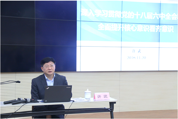 许武作了《深入学习贯彻党的十八届六中全会精神,全面提升核心意识、看齐意识》的主题党课报告。他为大家解读了十八届六中全会公报的主要内容,指出公报在充分肯定党的十八届五中全会以来在治国理政、从严治党方面所取得的重要成就的基础上,重点就加强和规范党内政治生活、加强党内监督作了严格而必要的规定。全会号召全党同志坚定不移维护党中央权威和集中统一领导,正式提出“以习近平同志为核心的党中央”,这在党的发展历史上具有十分重要的里程碑意义。