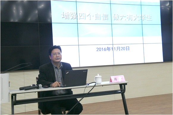 蒋一作了题为《增强四个自信、做六有大学生》的报告。他从四个自信、国家发展与民族复兴、当代大学生的责任、如何做好党员大学生四个方面,深入浅出地讲解了国内外形势及我国发展道路,更加坚定了同学们增强四个自信、争做合格大学生党员的信念。