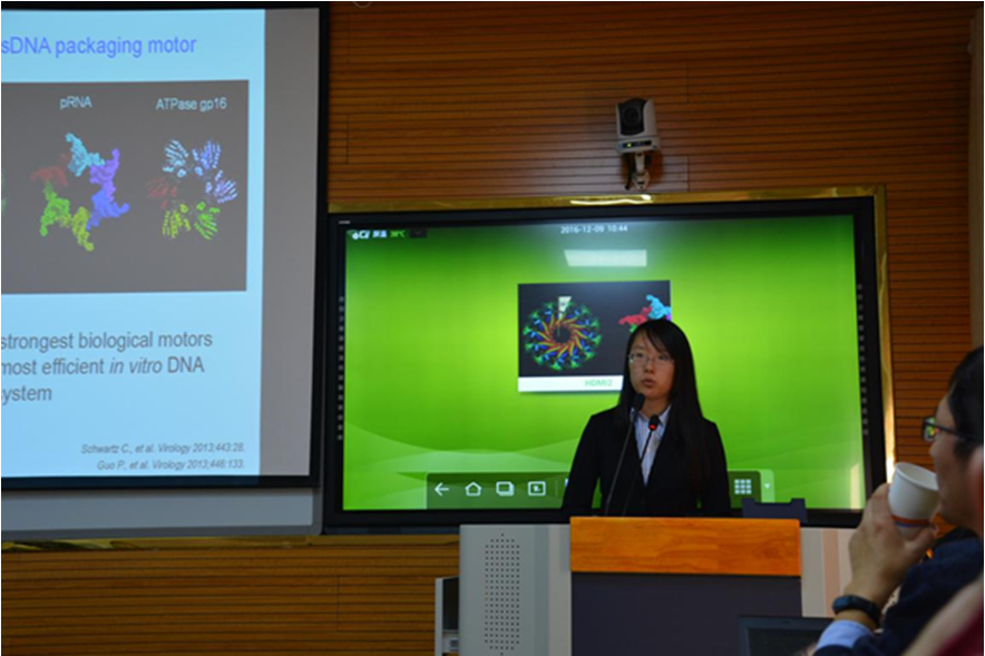 报告会题目为《单向运动纳米马达机理及应用研究》,是以纳米级Phi29噬菌体作为双链DNA包装马达为课题背景进行的研究。赵征怡博士先后介绍了所研究生物马达的主要结构,公转及单向性等特性,通过单孔道电导法等测试手段进行生物马达的构建及观察等等。她指出RNA纳米科技应用广泛,其产品具有容易制作及容易操作的优点,从几个纳米到几十纳米中都能较好的实现。