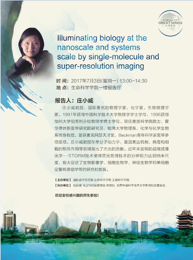 应学校邀请,国际著名的物理学家、化学家、生物物理学家庄小威将于7月3日来校作《Illuminating biology at the nanoscale and systems scale by single-molecule and super-resolution imaging》学术报告。