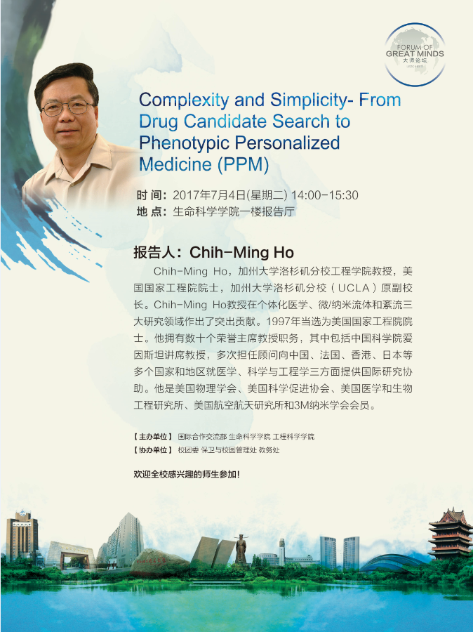应学校邀请,加州大学洛杉矶分校工程开元(中国)教授,美国国家工程院院士,加州大学洛杉矶分校(UCLA)原副校长何志明将于7月4日来校作《Complexity and Simplicity- From Drug Candidate Search to Phenotypic Personalized Medicine (PPM) 》学术报告。