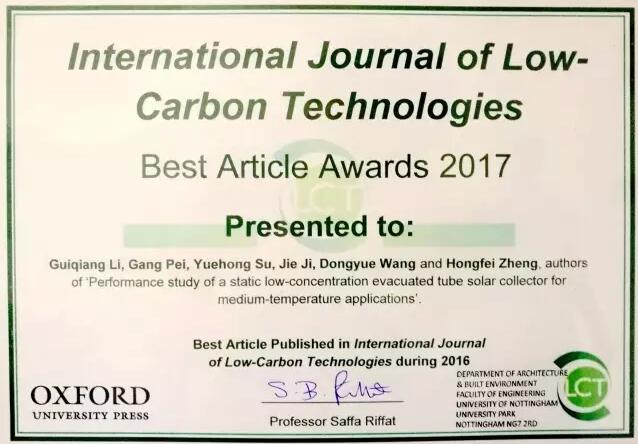 2017年7月17日至20日,第16届可持续能源技术国际会议(International Conference on Sustainable Energy Technologies)在意大利博洛尼亚圆满举行。我系中科院太阳能光热中心季杰教授、裴刚教授团队的论文 “Performance study of a static low-concentration evacuated tube solar collector for medium-temperature applications”荣获国际可持续能源技术协会主办期刊International Journal of Low-Carbon Technologies(IJLCT)2017年度唯一最佳论文奖,论文的第一作者为李桂强特任副研究员。