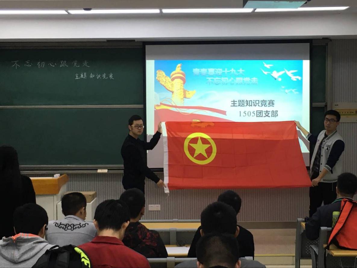 活动开始之前,班主任与团支书高举团旗与同学们合影。紧接着在同学们热烈的掌声中,知识竞赛正式拉开答题的序幕。