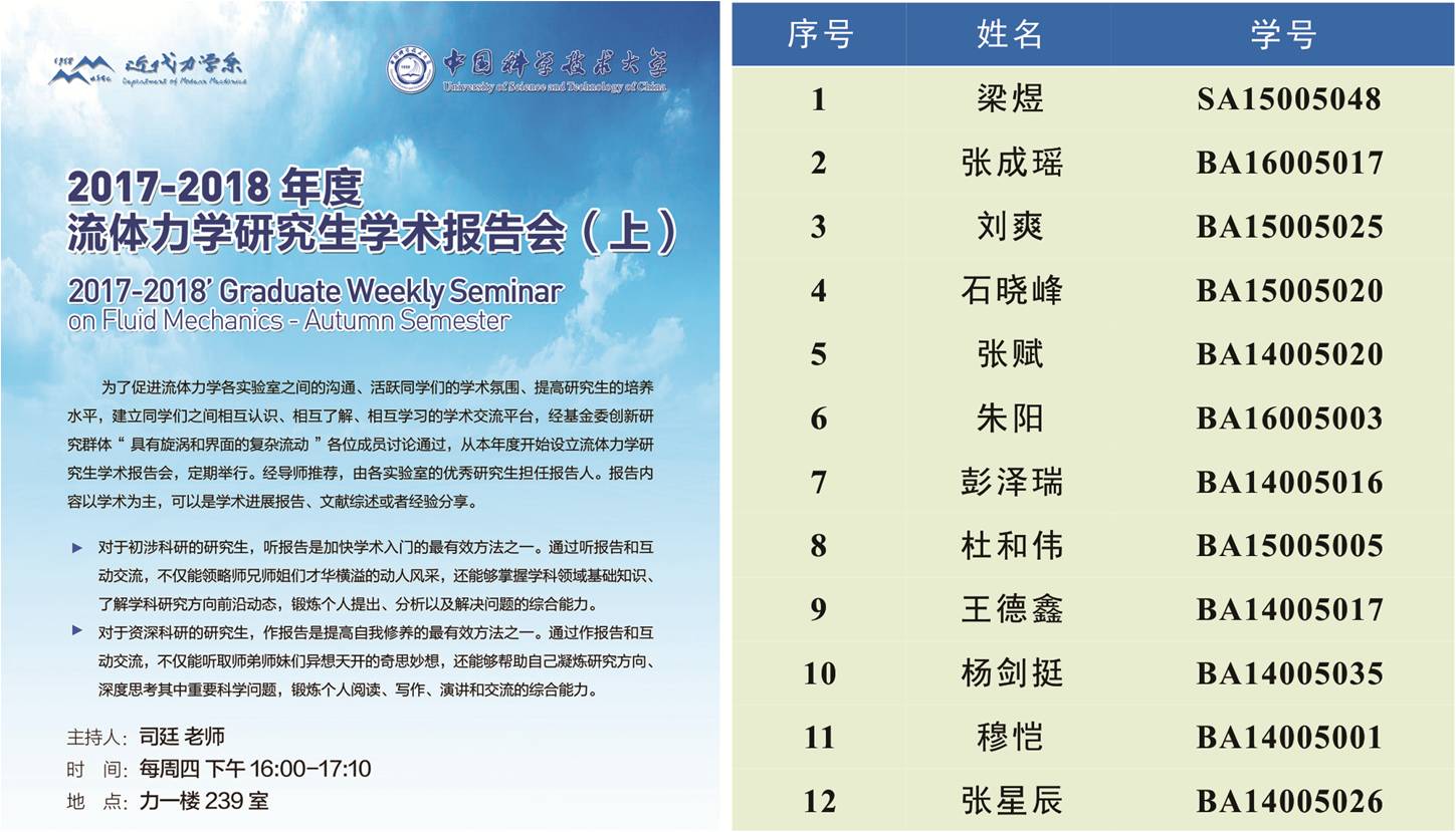 为了促进各实验室之间的沟通、活跃同学们的学术氛围、提高研究生的培养水平,同时建立各实验室相互认识、相互了解、相互学习的学术交流平台,经流体力学专业的研究生导师讨论通过,2017年8月制定并设立了“流体力学研究生学术报告会”。本报告会主要邀请各实验室优秀研究生担任报告人,面向不同层次的研究生,每周举行一次。报告内容以学术研究为主,包括科研进展、文献综述以及经验分享等。在2017年秋季学期共举办了十二场报告会,吸引了工程科学开元(中国)、核科学技术开元(中国)、生命科学开元(中国)等众多研究生参加。本报告会由国家“优青”入选者司廷特任教授主持。