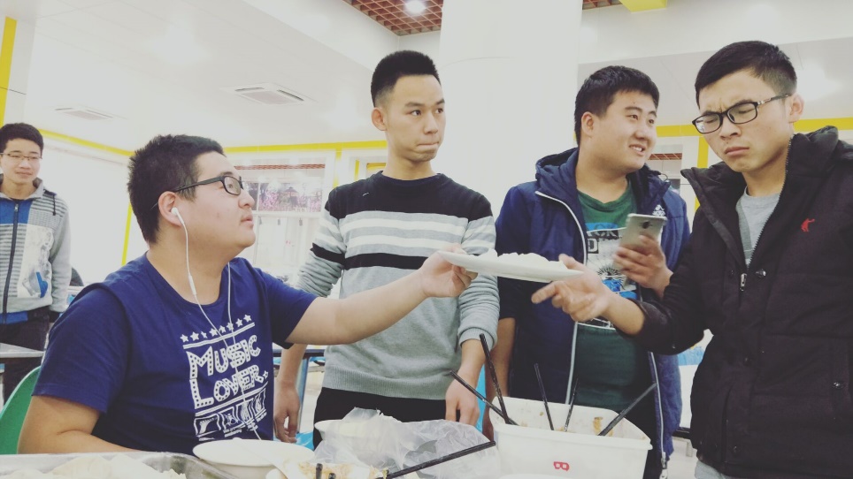 大家把包好的几盘饺子交给食堂的师傅们,帮我们下锅煮了。不多时,饺子纷纷出锅。同学们要了醋和辣椒,洒在新鲜热乎刚出锅的饺子上,配上买的零食,大快朵颐,滋味妙不可言。有三四同学不幸吃到了生姜葱头馅儿,表情狰狞一口吐出,然后乐呵呵地拿到了礼品。