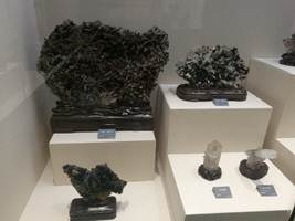 最漂亮的展区莫过于最后的矿物岩石厅,展厅中陈列着各种漂亮的矿物与岩石。各色的水晶,宝玉石,石英,一簇簇的方解石和石雕艺术品令人目不暇接。巨大的萤石,瑰丽的水晶簇自然形成的牡丹无不弥足珍贵。