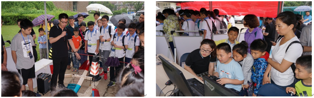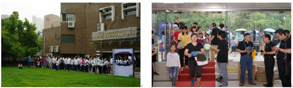 活动当天,凉风习习,虽然天空时而下起断断续续的小雨,仍然无法阻挡观众渴求知识的狂热,他们在力三楼门前排成长长的队伍,最长绵延至图书馆。每一位前来参观的观众脸上都洋溢着笑容,显示着浓厚的兴趣,在现场志愿者的组织协调下,有条不紊地依次进入各个科普展区进行参观。