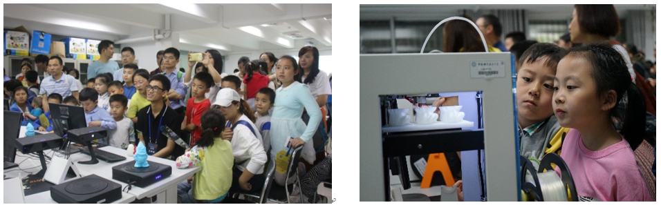 从激光3D内雕展区出来,观众进入到3D扫描及3D打印展区,目光所到之处是志愿者精心准备的一件件3D打印作品,视频中播放的是《十二生肖》的片段,大家熟悉的超能陆战队好多人物的盔甲不就是运用3D技术制作的吗?志愿者从此入手,给观众细细道来3D扫描及3D打印的发展。一些小朋友在志愿者的指导下,设计并打印出心仪的作品。