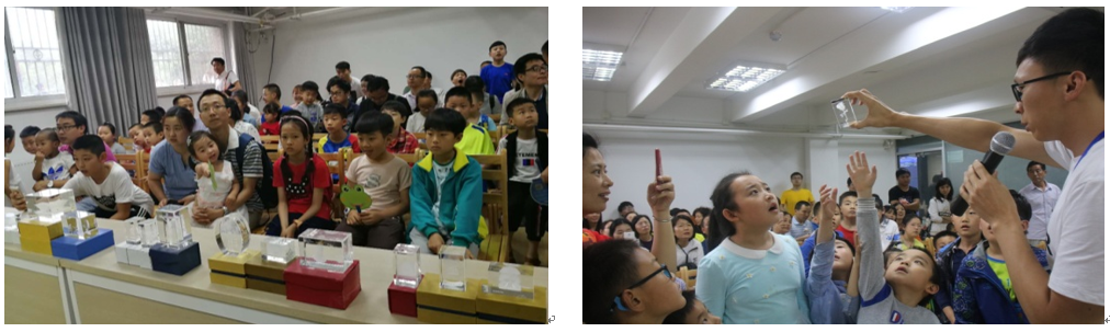 从智能机器人展区出来,观众进入到了激光3D内雕展区。印入眼帘的是色彩缤纷、形态各异的内雕作品:精美绝伦的建筑、姿态丰腴的人物、栩栩如生的“育鲲”轮、呼之欲出的人像,让人惊叹不已。志愿者先向观众简单介绍了工程实践中心以及拥有的先进实验设备。在同学们兴趣盎然之际,志愿者拿起一个激光内雕作品,向观众细致描绘了激光3D内雕工艺。另外观众还可以通过与志愿者的互动,小朋友们争先恐后的回答志愿者提出的小问题,从而获得志愿者精心准备的激光3D内雕工艺品,获得礼品的同学脸上都洋溢出满足的微笑。