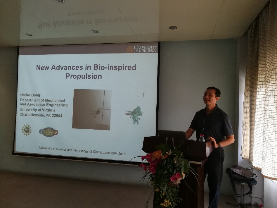 2018年6月29日上午10:00,美国弗吉尼亚大学董海波教授应陆夕云教授邀请来到近代力学系作了题为“仿生推进技术的新进展”的高水平报告。报告会由黄海波主持,孙德军、罗喜胜、丁航、司廷、刘难生、秦丰华、黄颖青等老师和众多感兴趣研究生参加了报告会。
