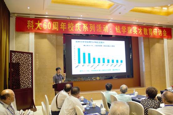 现任近代力学系主任丁航汇报系况。中科大建校至今,近代力学系共计培养了11位两院院士,9位共和国将军,远远超过“千生一院士”的比例。近年来力学系在青年骨干人才培养,优质学科建设,科学技术创新,国家科研项目研究等领域都取得了十分令人瞩目的成果。