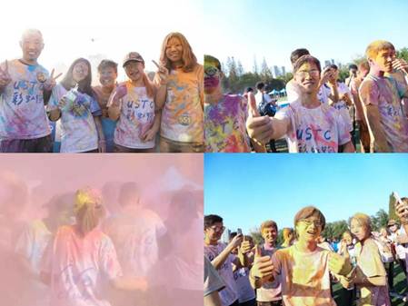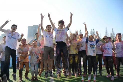 最后,活动迎来了最疯狂的互动环节:彩粉大战!男女同学完全放下了游戏刚开始的陌生拘谨,对着身边的玩伴不顾一切的肆意泼洒,将现场的氛围再一次推向了高潮。