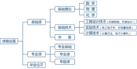 他说,中国科学技术大学将基础课分成基础理论和基础技术两大类,基础理论就是数学、物理和化学。基础技术包括工程设计技术(机械制图、机械设计)、实验技术(电工电子学、非电量电测)和计算技术(计算方法、电子计算机)三类。再加上外语,这就构成了中国科学技术大学公共基础课的基本框架(如图1所示)。在中国科学技术大学,整个基础理论课约占总学时的1/3左右, 技术基础课也占到总学时的百分之十几。这样,基础理论课要比一般工科院校多,基础技术课又多于一般理科专业。这就体现了鲜明的“理工结合”的特色。