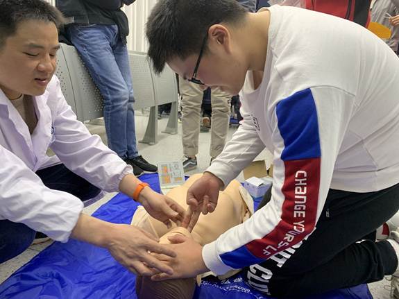 为使同学们进一步熟悉心肺复苏术,吕医生特地携带了三个假人模型供同学们进行模拟演练。同学们分成三组,有序地进行着实践。由于大家基本都是第一次进行实际操作,像开放气道这种较为复杂的操作往往不得要领。校医院的医生护士们对我们进行一对一的指导,经过反复练习,大家都掌握了方法,通过了仪器的测试。训练之余,吕医生还给我们讲解了自动体外除颤仪的使用,进一步拓展了我们的急救常识。
