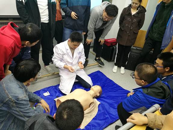 晚上七点,同学们准时来到教室,活动开始。首先吕医生介绍了一些基本的急救知识,谈到了发生心跳骤停后的几个重要时间节点。吕医生强调,心跳骤停后的急救就是在和时间赛跑,越早接受急救,患者的生存概率就越大,希望大家都能够掌握心肺复苏这项急救技能,以备不时之需。