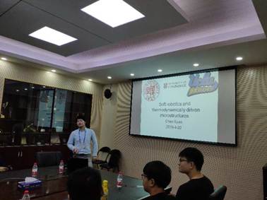 宣辰博士做了题为“Soft robotics and thermodynamically driven microstructures”的报告。他在报告中介绍了一种人造软体毛毛虫机器人,并对光照驱动弹性液晶软体机器人进行了力学建模,指出软固体拉伸时的Plateau-Rayleigh不稳定性是一种简单相分离,最后对弹性液晶软体机器人的应用做了展望。