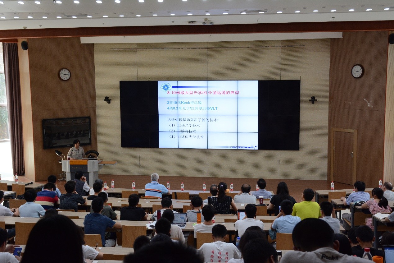 崔向群院士首先介绍了国际天文光学望远镜的发展历史和国内外研究现状,列举了世界前沿的多项天文望远镜技术,提出了当今天文观测设备的发展趋势包括更高的空间、时间和光谱分辨率、更大的视场以及更大的观测口径。随后她详细介绍了我国自主创新研制的大天区面积多目标光纤光谱望远镜LAMOST。 LAMOST应用主动光学技术控制反射改正板,突破了常规望远镜大视场和大口径不能兼得的瓶颈,并通过焦面上的四千根光纤和多台光谱仪获取遥远天体的光谱,使其成为世界上光谱获取率最高的大口径大视场天文望远镜,将我国天文望远镜研制水平推进到国际前沿,为研制下一代极大口径望远镜创造了条件。崔院士指出,天文望远镜的发展不断提升了人类对宇宙的认识。另一方面,人类对宇宙的探索进一步延伸到了引力波、宇宙射线和暗物质领域,需要建造10米口径的通用型地面大型光学红外望远镜以及一批有特色的天文光学望远镜,尽快缩小我国地面光学天文装置与国际的差距。崔院士激情澎湃的讲座赢得了同学们一阵又一阵的掌声,崔院士对未知世界、对知识的无限渴求,对工作的满腔热忱也深深的震撼了同学们的内心。