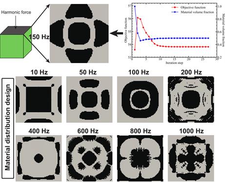 陈海波教授研究组将有限元方法和快速多极声学边界元方法相结合,建立了声振强耦合的有效分析模型,并且在响应分析的基础上,通过对快速多极算法的有效变换,实现了结构优化中声学灵敏度分析的加速计算,最终大大提升了拓扑优化的计算效率。该研究提出了一套适用于强耦合分析的声学灵敏度计算方法,为涉及无限域振动结构的声学拓扑优化提供了有效的分析方法,并且揭示了频率依赖性等声学优化所具有的特性。