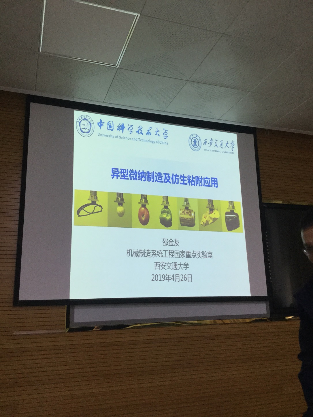 2019年04月26日下午15:00,西安交通大学邵金友教授应精密机械与精密仪器系吴东老师邀请,于力学二楼215多媒体教室给我院师生带来题为“异形微纳结构压印制造及仿生粘附应用”的学术交流报告。