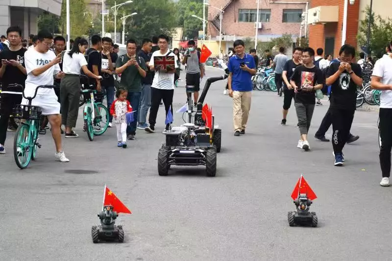 随后,由两台“robomaster S1”以及六轮越障车、“husky”四轮车、激光雷达无人车组成的车队高举国旗沿中区主路一路向前,带领围观同学和教职工共同欢庆祖国华诞。