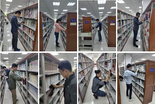 集合完毕后,在图书馆老师的指导下,本支部的各位党员同志们三两成组,有整理图书、擦拭图书架的;有拖地、打扫地面卫生的;还有整理图书,重新摆放的。分工明确,有条不紊的进行着图书架位整理清洁活动。此次的整理清洁活动中,同学们还发现了部分图书的标签存在严重破损的情况。因而在完成书架的整理清洁之后,同学们寻找出了标签破损的书籍,由教工支部的老师们进行了修补。