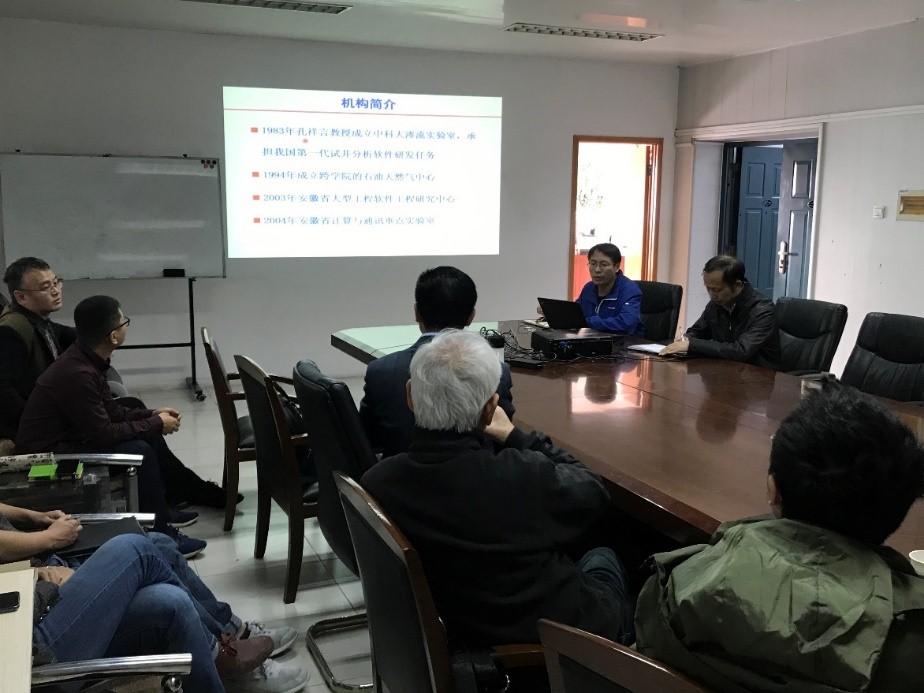 邹院士首先参观了中国科学技术大学石油与天然气研究中心。中心主任卢德唐教授介绍了中国科学技术大学30多年来,在石油天然气方面开展的科学研究、取得的相关成果及其在三大石油公司中的实际应用;重点介绍了页岩气的开发取得的研究成果,如研制了国际上首台用于页岩致裂实验的真三轴大型实验装置,纳米-微米-宏观千米级的页岩赋存及流动机理,研发的系列软件在页岩气1000多井(段)上应用,解决了我国页岩开发中部分“卡脖子”问题等。邹院士对中国科学技术大学这些年在油气领域尤其是在页岩气方面的研究成果表示赞赏,真正实现了基础理论到应用全过程研究,并现场就一些页岩气问题与我校诸位老师进行了热烈讨论,同时希望石油天然气中心参加国家2020-2035油气重大战略项目,利用中国科学技术大学的数理学科优势,从页岩气、致密油气及煤层气流动机理出发,从源头创新,不仅解决“卡脖子”问题,更要实现自主创新。