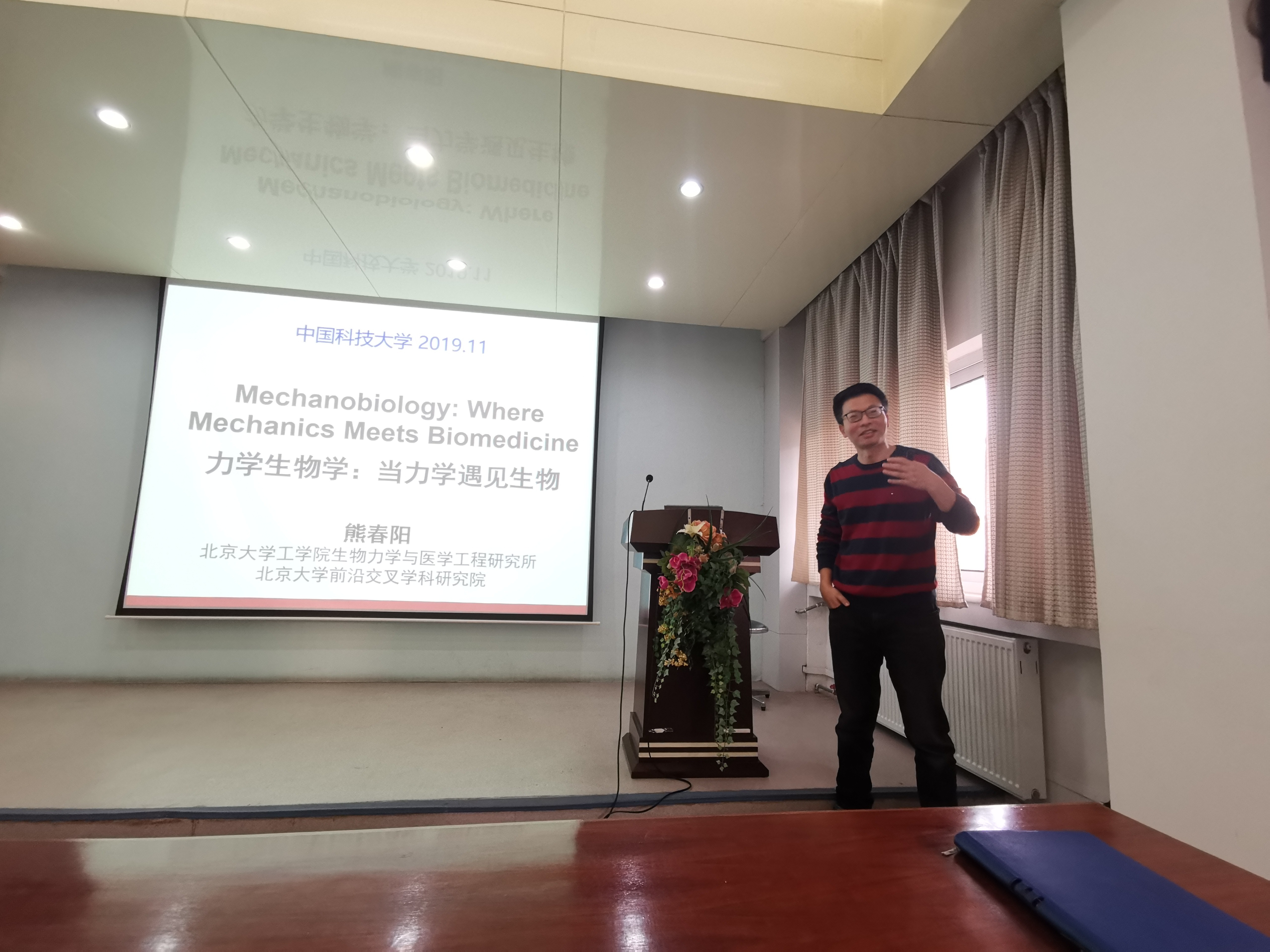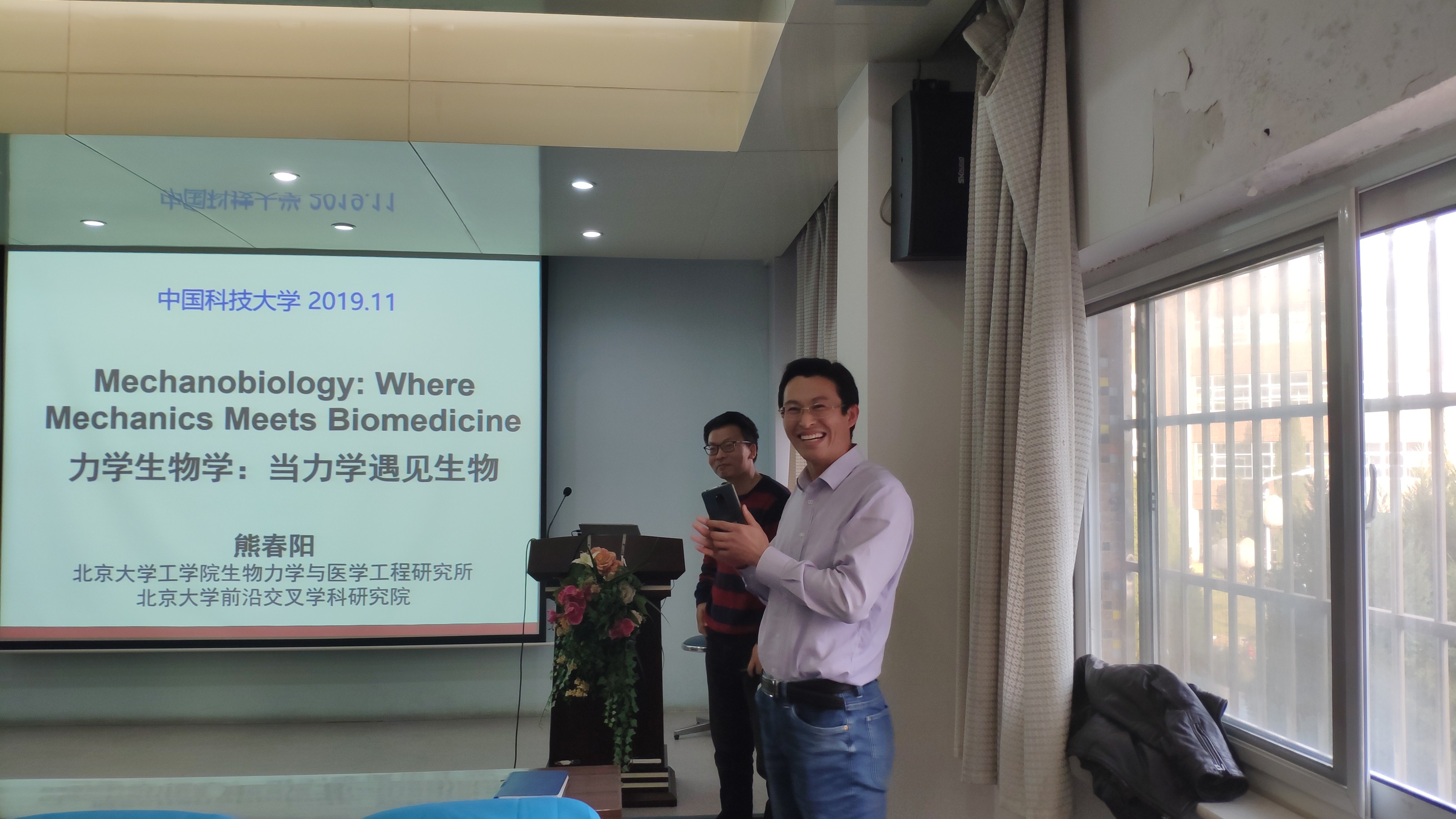 11月13日下午4点,北京大学熊春阳教授在力一楼239会议室受邀做学术报告,题目为“Mechanobiology: Where Mechanics Meets Biomedicine”,近百名研究生参加了此次报告会。工程科学开元(中国)执行院长吴恒安教授、副院长裴刚教授到场并致辞。报告会由近代力学系司廷教授主持。