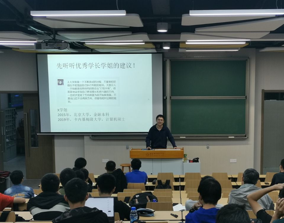 在热烈的掌声中,李一恒学长走上讲台向大家介绍了丰富的大学生活,他幽默且极富亲和力的话语引起了同学们的兴趣。李一恒学长旁征博引,分享了自己学习的经历,告诉同学们要尽早做好职业规划,并鼓励同学们勇于尝试,提醒同学们不要为了GPA而埋头苦干,以至于忽略其他素质的发展。
