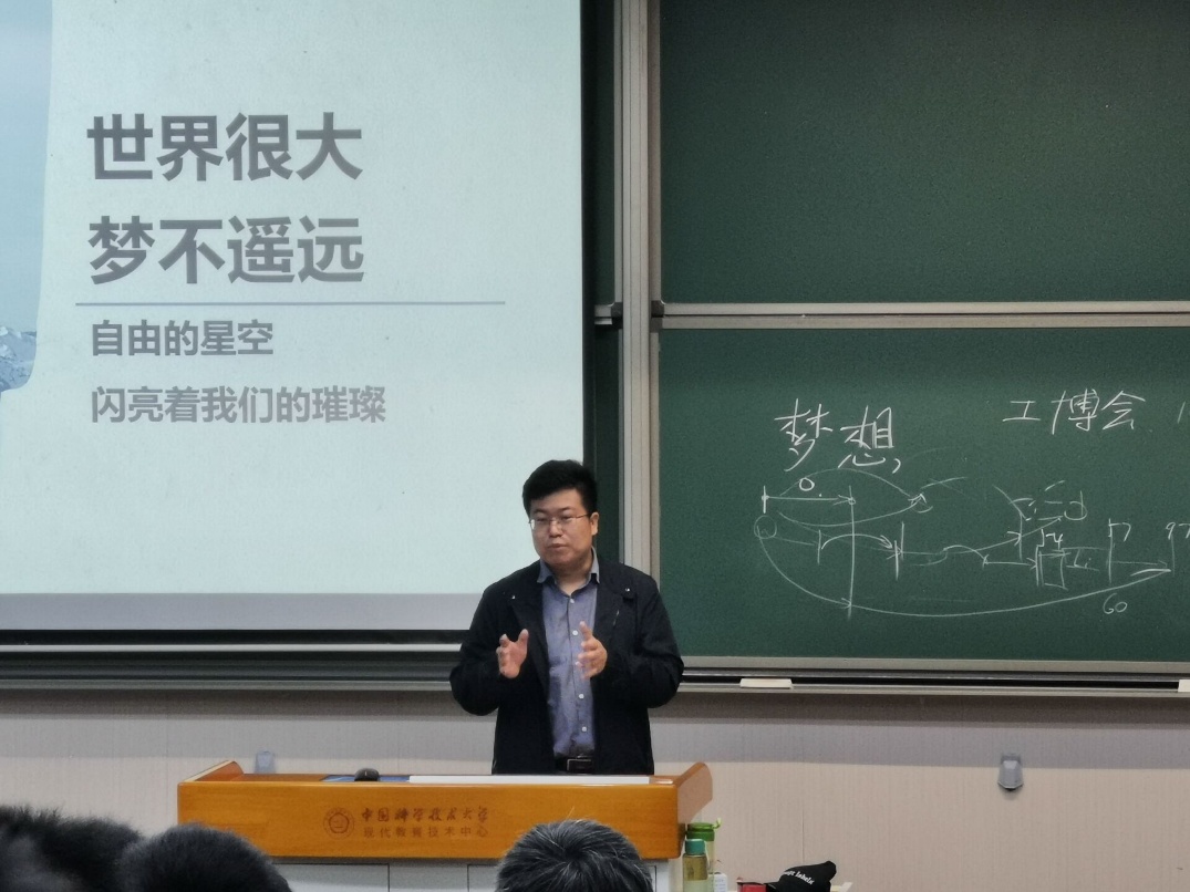 在学长分享经验之后,班主任董二宝老师上台讲话。董二宝老师以“现实的梦想主义者”为题目,首先讲述了当今世界的一些科技产业发展趋势,希望同学们多去图书馆和网上数据库里检索阅读国内外科技报告和专业书籍,将个人专业兴趣与国家命运相结合,传承中科大人勇于使命担当,践行科技报国的理想信念。并以生动比喻阐述“如果把中学的学习比作河道中的龙舟竞渡,那么大学的学习则是汪洋大海中的扬帆远航”,以梦想为航向才不至于迷航,而每个同学都将拥有属于自己的航向。世界很大,梦不遥远,鼓励同学们脚踏实地,追求梦想。