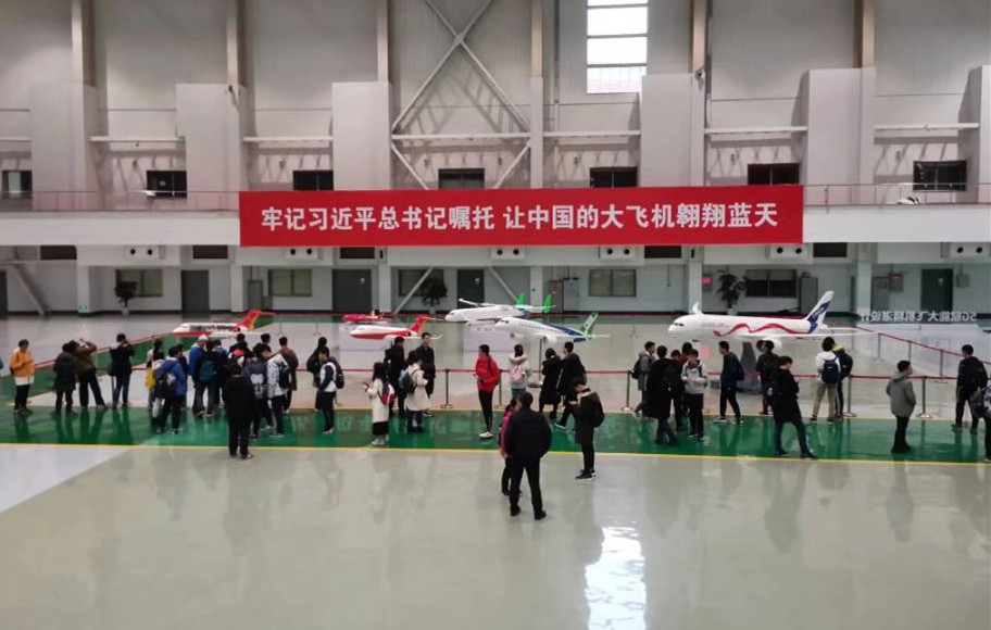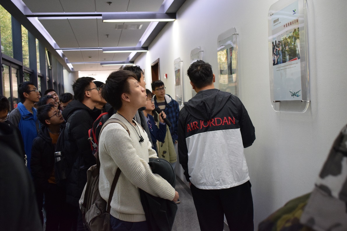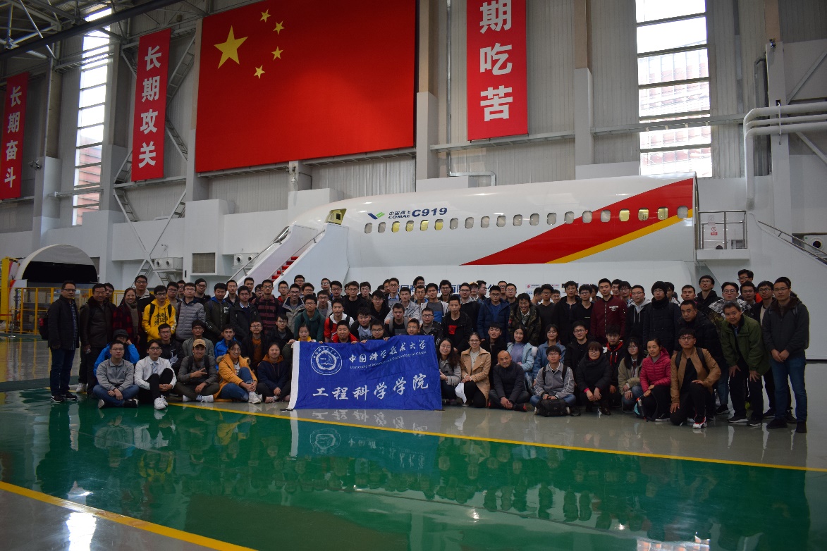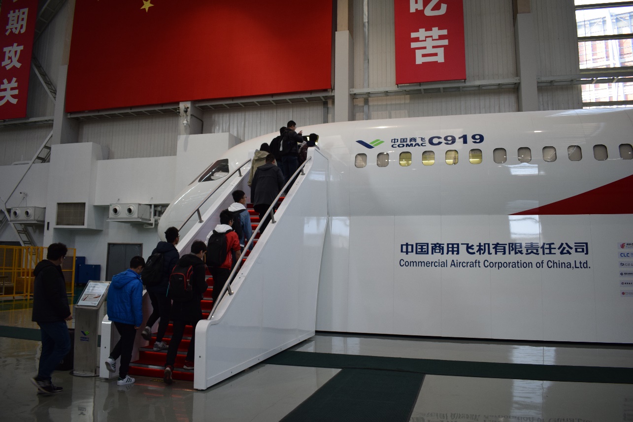 在中国商飞上海飞机设计研究院飞机结构强度工程技术研究所党总支书记李衢,结构功能部副部长、我校工程科学开元(中国)0109级毕业生方俊伟,C919大型客机总师助理、飞机集成部噪声与排放室主任、我校工程科学开元(中国)0105级毕业生孙一峰,党政办副主任方淳,校友李向哲、叶冬森的陪同下,同学们沿着习近平总书记2014年的视察路线,先后参观了商飞“一个总部、六大中心”的整体布局沙盘、文化长廊、大飞机总装车间,听取了工作人员对C919大型客机的研发历程、设计理念等方面的详细介绍,登上了中国自主研制的C919大型客机展示样机,近距离了解飞机驾驶操作系统的组成情况,亲身感受机舱内舒适的环境,实地了解到“让中国的大飞机翱翔蓝天”的科技中国梦。