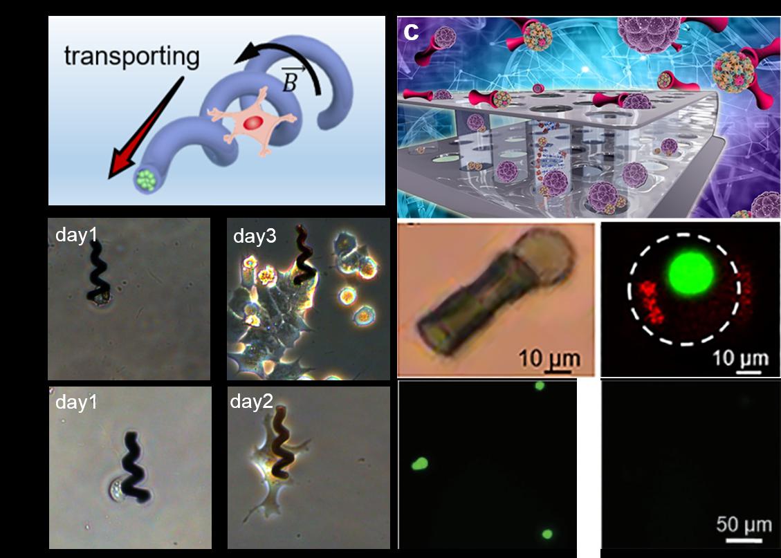 最后,研究人员利用锥形空心螺旋结构内部与外部分别装载纳米及微米级货物,并在体外完成了神经干细胞的移植;利用管装微结构装载运输抗癌药物(DOX)对癌细胞(Hela)进行有效治疗,并通过荧光验证治疗效果。这些工作提出了简单稳定的空心管状、锥形螺旋微电机加工操纵技术,在细胞移植、体内药物运输、无创手术等领域具有重要应用前景,为相关生物医疗领域提供了新的技术手段。