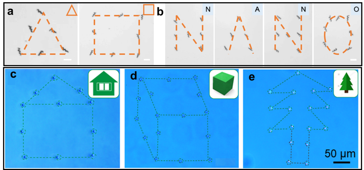 除此之外,利用磁场梯度和方向的变化可以有效完成微结构的精确导向,空心锥形螺旋在旋转磁场下完成各种复杂图案化轨迹运动(如图3所示),空心管状结构在梯度磁场下完成SiO2微球的装载、运输、排列与释放。