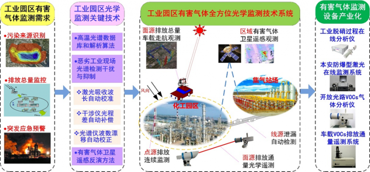 该项目针对工业园区有毒有害气体来源识别、排放监控以及突发事件应急预警等重大技术需求,创新发展了工业园区有毒有害气体光学监测技术和方法,创建了有毒有害气体高温高光谱测量数据库和模型,突破了高气溶胶背景下的大气痕量气体成分卫星反演技术,形成了具有自主知识产权的工业园区有毒有害气体点-线-面-区域全方位光学监测系统,并在四川、云南、安徽、甘肃、江西、内蒙古等地的石化、冶金、水泥、电力等行业开展示范应用,让工业园区有毒有害气体无所遁形。这一项目为今后我国工业园区的污染控制和减排提供了重要的技术支撑,有效弥补了现有监测技术在工业园区监测手段、监测内容和监测范围的不足,填补了工业园区有毒有害气体全方位监测领域技术空白,为我国工业园区有毒有害气体控制与治理提供了重要的科学数据,促进我国环境监测仪器产业的跨越发展。