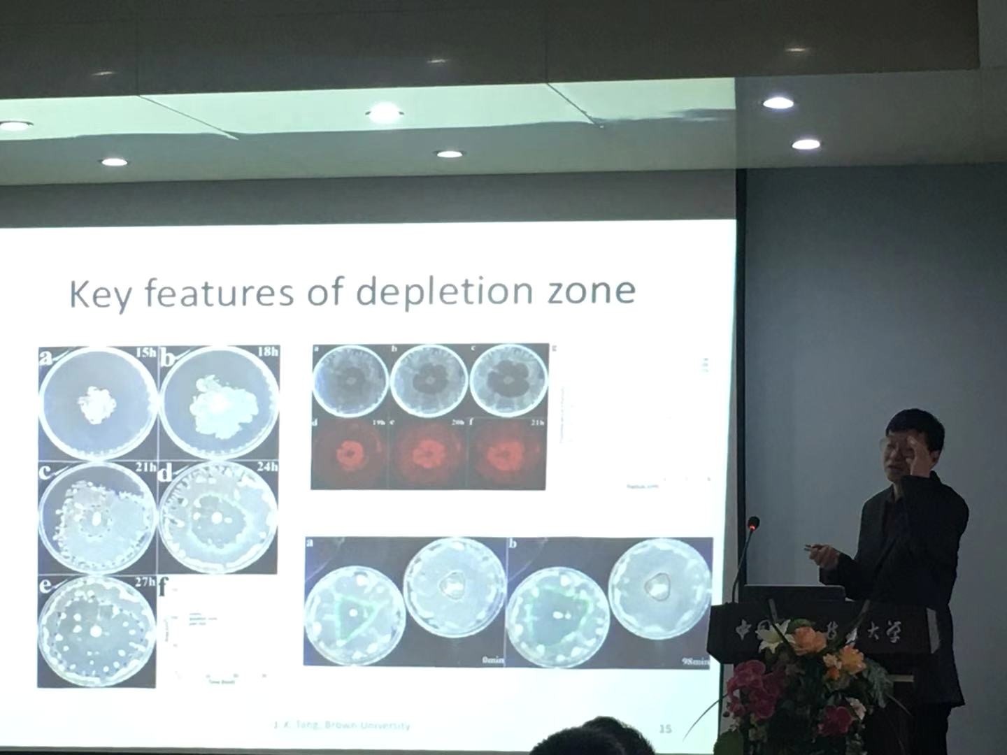 唐建新教授给与会师生带来了一场精彩的学术报告。唐建新教授介绍到许多种类的细菌都有很强的在固体表面传播的能力。其课题组研究的重点是在琼脂表面扩展的人类病原体铜绿假单胞菌菌落内的模式进化。他们研究了从菌落中心区域开始的细菌膜厚度显著下降的耗尽区的发生和扩展。此外,为了解释液滴的发生和生长,其课题组提出了一个基于细菌膜有效自由能最小化的模型。该模型考虑到薄膜流体动力学和细菌的主动运动,以及细菌最大限度地获取养分的趋势。该模型的模拟结果成功地解释了细菌液滴的发生和生长。在自由讨论环节,与会师生积极提问交流,反响热烈。
