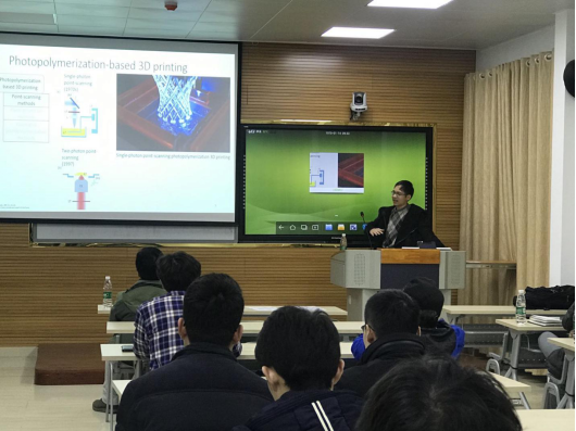 1月17日上午10点在力二楼215会议室,美国加州大学圣地亚哥分校游尚挺博士应邀为我校师生做题为“Photopolymerization-based microscale 3D printing and its bio-applications”的学术报告,报告会由李家文副教授主持。