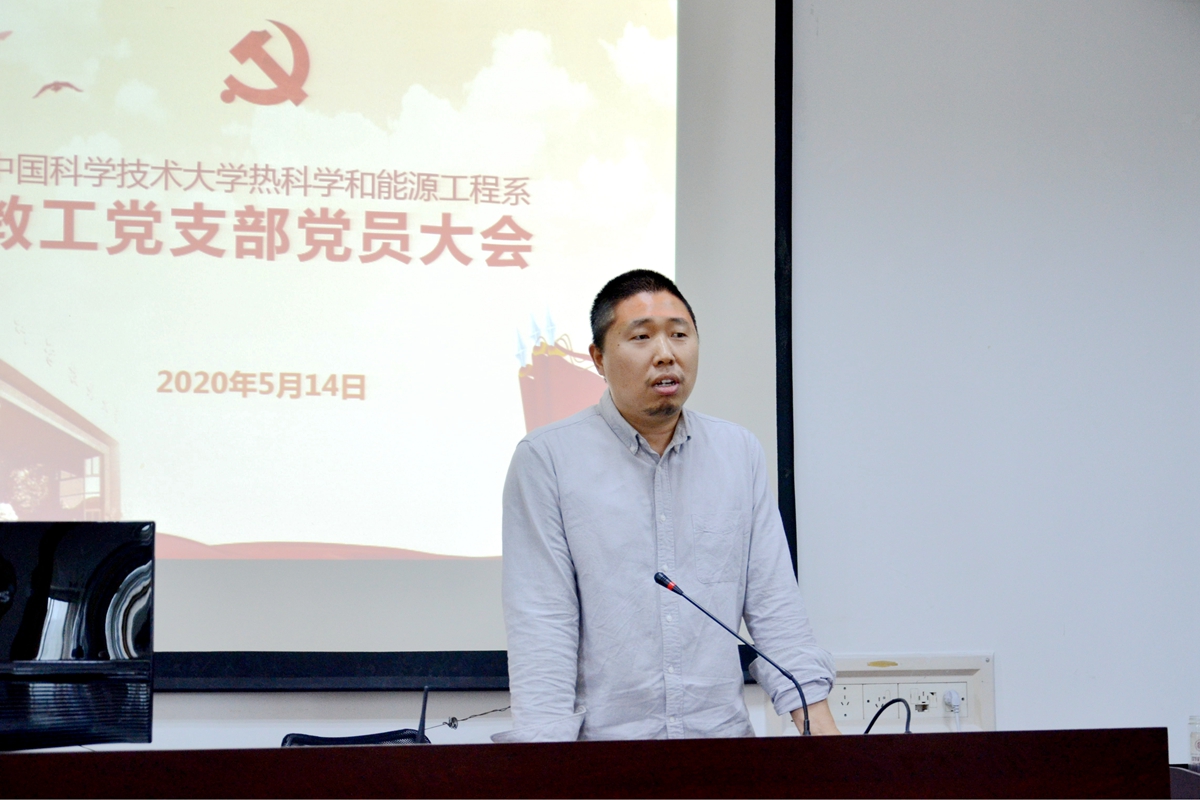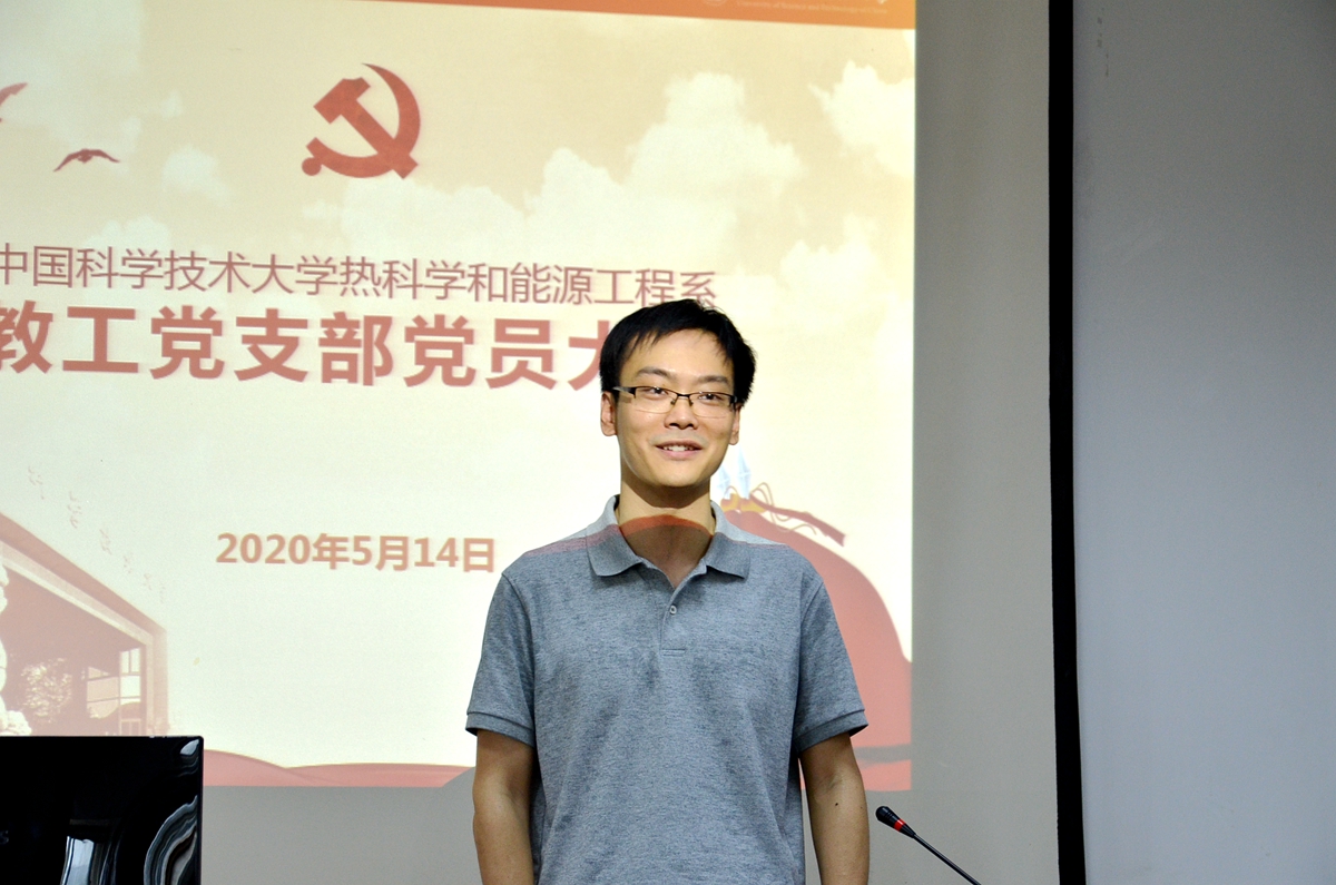 5月14日上午,热科学和能源工程系教工党支部召开党员大会,就接收谈鹏和施安峰两位发展对象为中共预备党员进行讨论和表决。支部正式党员参加了会议。会议由教工党支部书记、系执行主任程文龙教授主持。