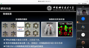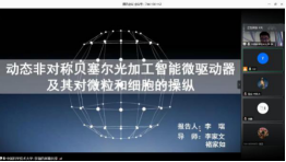 辛晨同学以“飞秒全息高效制备磁控微机器人及其应用”为题介绍了一种基于空间光调制技术的新型加工方法,可高效可控地制备出多种参数的空心锥形螺旋微机器人。在三维旋转匀强磁场控制系统下,可实现该机器人的高效驱动和精确导航,实现了纳米粒子与神经干细胞的装载、运输与释放,为生物医疗领域提供了新的技术工具。