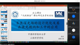 潘登同学以“长焦深光场的设计优化及其在激光微纳加工中的应用”为题介绍了首次将长焦深光场应用于飞秒激光双光子聚合领域,实现高精度,高长径比的微结构快速制备与加工的研究工作,同时首次提出在纯相位空间光调制器上对长焦深光场进行相位-振幅复合优化。该长焦深光场的生成与优化在高分辨成像,光镊,钻深孔等领域有着广阔的应用前景。