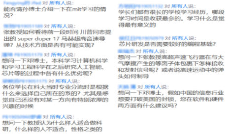 互动交流环节,同学们在平台上踊跃提问,积极与四位学长就自己关心的问题进行交流探讨,学长们也一一给予耐心解答。